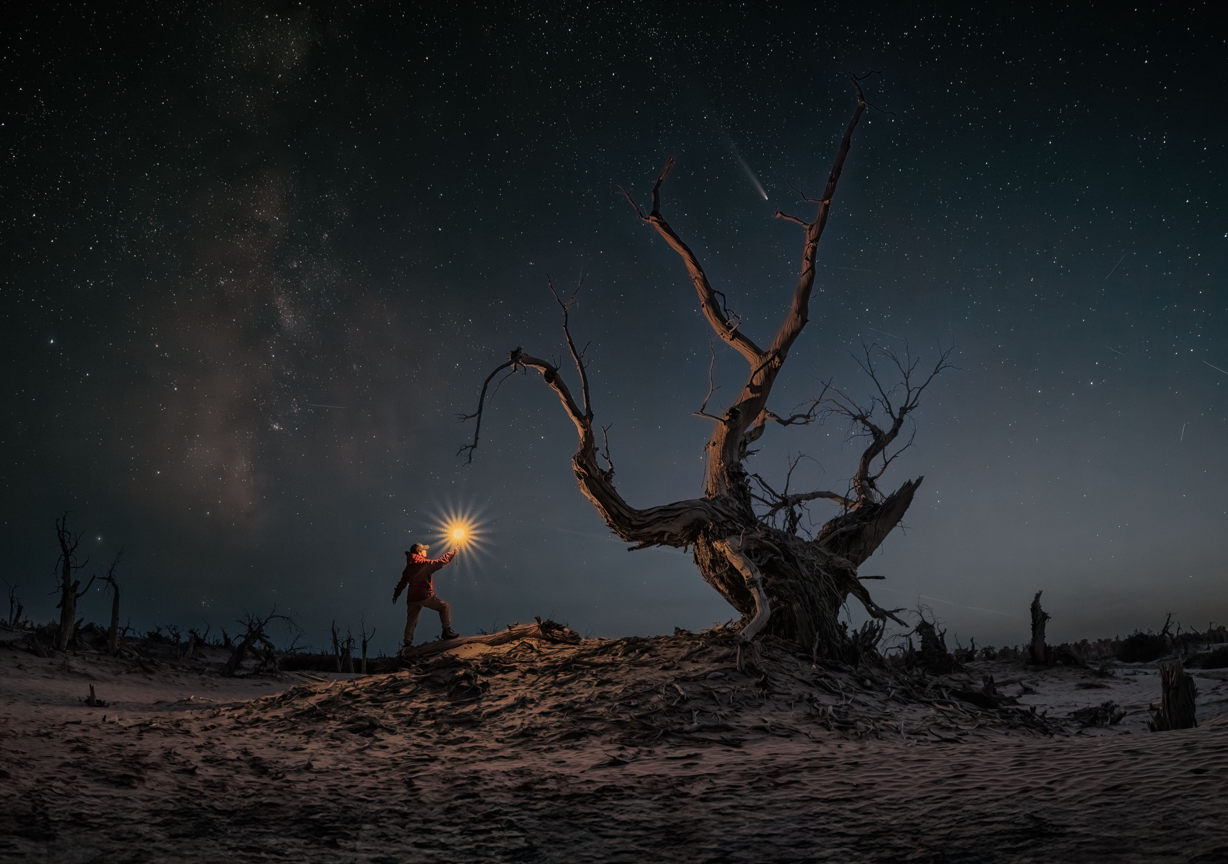 That trip was especially meaningful because I met Liu Bai, my first photographic guide. He is a young and outstanding Chinese photographer whose work made a deep impression on me. In September 2020, I joined him on another trip, this time to the Badain Jaran Desert. I remember standing barefoot in the sand, holding a brand-new 70–200 mm lens that I hadn't even unpacked yet. Another photographer, Tony Wang, helped me change lenses while I was overwhelmed with excitement. Suddenly, a companion shouted, 'You've ruined my foreground.' At that moment, I realised how inexperienced I truly was.